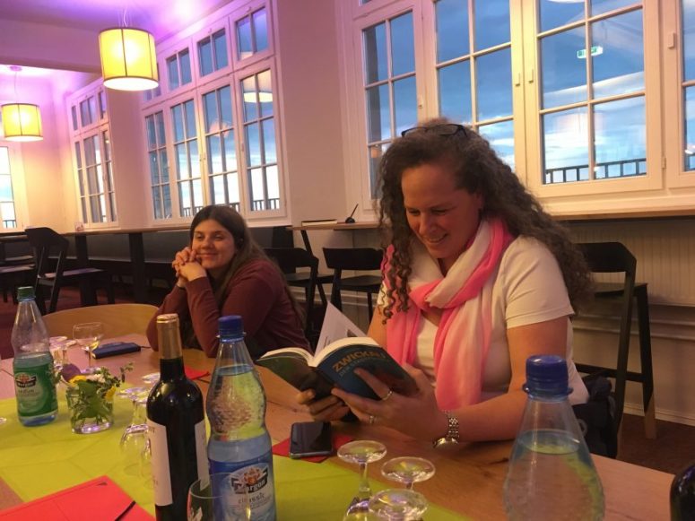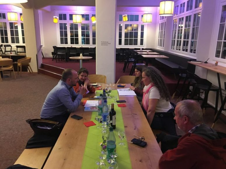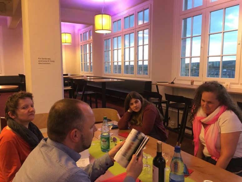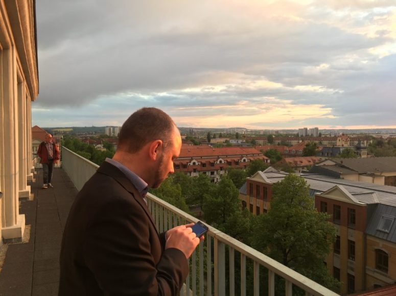 Der Stammtisch fand anschließend im Turmcafé der Technischen Sammlungen Dresden in kleiner Runde, dafür mit großartiger Aussicht statt. Die goldene Abendstimmung inspirierte die Teilnehmer zunächst selbst zu einer Fotosession auf der Terrasse, bevor Gastblogger Christian Adler mit vielen Anekdoten herzhaft Lust darauf machte, einmal nach Zwickau zu fahren.
